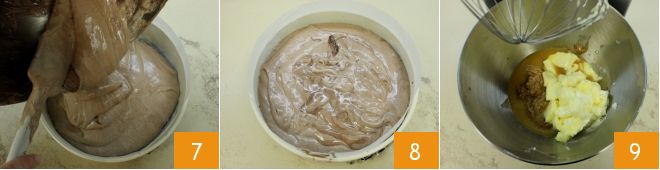 Ahora puedes forrar un molde con papel de horno; puedes usar un molde de 24 cm de diámetro (mejor si es desmontable) y, en su defecto, puedes enmantequillarlo y enharinarlo. Vierte delicadamente la masa en el molde 7 y nivélala para uniformar la superficie 8. Coloca el bizcocho a cocer en horno estático precalentado a 180° por 45 minutos (si es horno ventilado, a 160° por 35-40 minutos). Mientras el bizcocho se cuece, dedícate a la crema de avellana: en el bol de la batidora, mezcla la mantequilla ablandada y la pasta de avellana 9.
