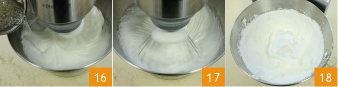 Cuando el jarabe haya alcanzado los 121°, retíralo del fuego y, continuando montando las claras, añade el jarabe caliente en forma de hilo 16; deberás montar las claras con el jarabe 17 hasta que la mezcla esté completamente fría, para obtener un merengue suave 18.