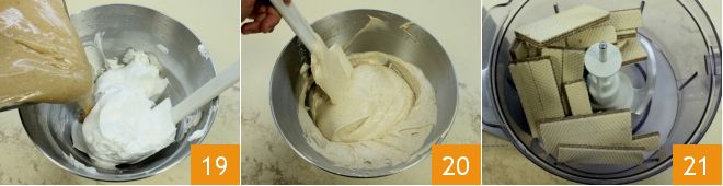 Cuando el merengue esté bien frío, detén las varillas y añade la crema de avellana 19, mezclando los dos compuestos delicadamente de abajo hacia arriba con una espátula 20. Luego, en un procesador de alimentos, vierte los barquillos de avellana 21.