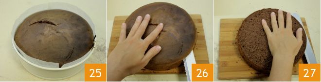 Después de los 45 minutos, puedes sacar del horno el bizcocho de cacao 25. Déjalo enfriar completamente, luego desmóldalo y colócalo sobre una tabla de cortar para obtener tres discos de 1 cm de grosor cada uno, ayudándote con un cuchillo de hoja fina. Para esta operación también puedes consultar la Escuela de cocina: cómo cortar el bizcocho. Luego procede obteniendo el primer disco 26 y luego pasa a dividir el bizcocho restante 27.
