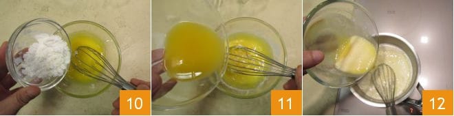 Vierte también la maicena 10 y el jugo de naranja 11. Sigue mezclando con el batidor y añade la mezcla a la leche y la nata calientes 12.