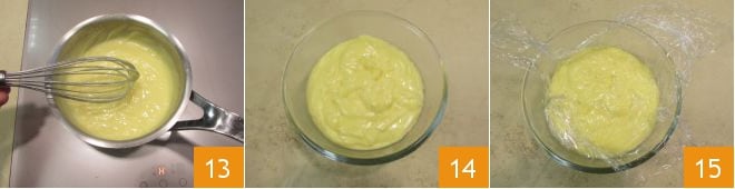 Cocina la crema mezclando con un batidor a fuego lento 13. Cuando comience a espesarse, retírala del fuego y continúa mezclando enérgicamente hasta que esté suave y homogénea. Transfiere la crema a un bol 14, cúbrela con film transparente en contacto y enfríala en el frigorífico durante al menos 40 minutos 15.