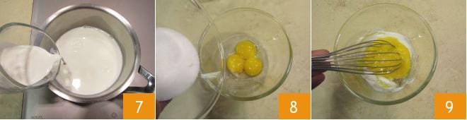 Mientras tanto, prepara la crema calentando la leche y la nata en un cazo hasta casi hervir 7. Mezcla en un bol con un batidor los yemas, el azúcar 8 y la ralladura de naranja 9.
