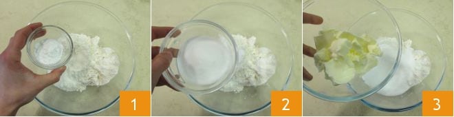 Para preparar la tarta con crema de naranja, comienza preparando la masa quebrada: en un bol, vierte la harina, la levadura 1 y el azúcar 2, luego añade la mantequilla fría 3 en trozos y procede con el 'arenado' a mano, pellizcando la masa con los dedos para obtener migas.