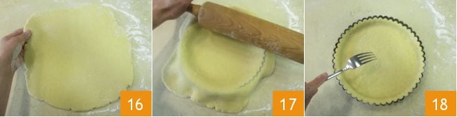 Después del tiempo de reposo, saca la crema y la masa del frigorífico, extiende la masa hasta un grosor de medio centímetro 16 y luego colócala en un molde de 18 centímetros de diámetro, con fondo desmontable y previamente enmantecado, asegurándote de eliminar el exceso de masa presionando con el propio rodillo 17. Pincha el fondo con un tenedor 18.