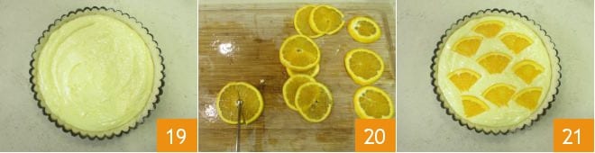 Rellénala con la crema fría que habrás suavizado trabajándola brevemente con un batidor manual si es necesario 19. Corta la naranja en rodajas de unos dos milímetros 20 y redúcelas a cuartos. Coloca las rodajas de naranja en la superficie de la tarta como decoración 21.