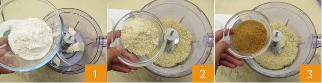 Para preparar la tarta con crema de té matcha, como primer paso, empieza por preparar la masa quebrada. Vierte la mantequilla fría en cubos en el recipiente de un procesador de alimentos con cuchillas, añade la harina 00 1 y tritura todo hasta obtener una mezcla desmenuzada. Luego, añade la harina de almendra 2, el azúcar de caña integral 3 y tritura nuevamente hasta obtener una mezcla homogénea.