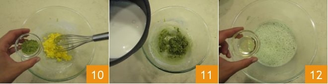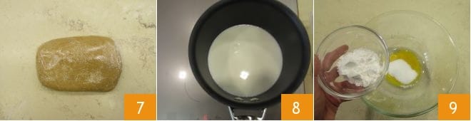 Forma un bloque, envuélvelo en papel film 7 y colócalo en el refrigerador para que se endurezca durante al menos 40 minutos. Mientras tanto, prepárate para hacer la crema de té matcha. Vierte la leche en un cazo 8 y caliéntala hasta que esté a punto de hervir. Mientras tanto, vierte las yemas, el azúcar y el almidón de maíz en un bol 9; bate rápidamente con un batidor.