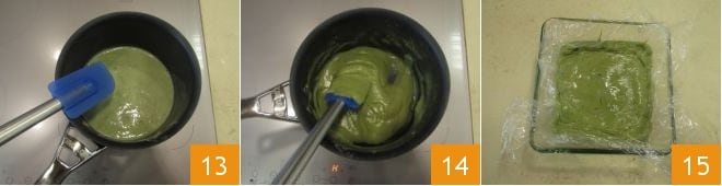 y vuelve a transferir la mezcla en el cazo 13. Cocina durante unos minutos a fuego lento, removiendo siempre hasta que la crema se haya espesado 14. En este punto, viértela en una fuente para hornear, cúbrela con papel film en contacto 15 y deja enfriar en el frigorífico.
