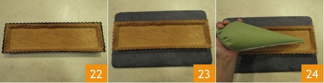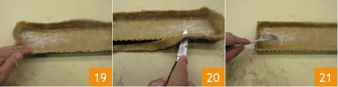 y utilizando las yemas de los dedos, adhiere la masa quebrada al molde 19. Elimina el exceso de masa utilizando un cuchillo 20 y pincha el fondo de la tarta con un tenedor 21.