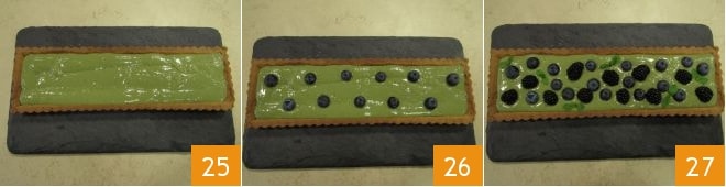 Nivela la superficie 25 y decora con los arándanos frescos 26, las moras y algunas hojitas de menta. ¡Tu tarta de té matcha está lista para ser servida 27!