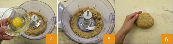 En este punto, añade el huevo entero 4 y tritura nuevamente todo 5. Luego, coloca la masa quebrada en una superficie ligeramente enharinada y trabaja la masa durante unos segundos 6.
