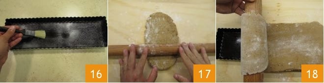 Ahora, engrasa un molde rectangular de 35,5x10,5 16. Retoma la masa quebrada y extiéndela sobre una superficie ligeramente enharinada 17, de manera que formes un rectángulo de medio cm de grosor. Ayudándote con el rodillo, transfiere la masa al molde 18