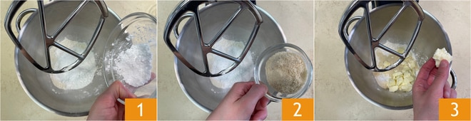 Para preparar la tarta con crema pastelera, chantilly y ciruelas: en el robot de cocina vierta los polvos 1 2, la sal y la mantequilla fría en trozos 3.