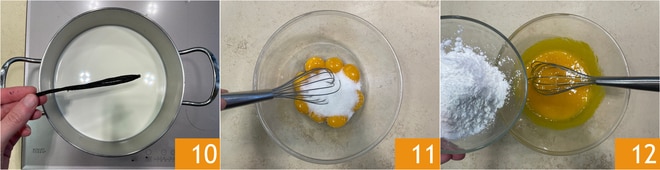 Para la crema pastelera: en una cacerola lleve a punto de ebullición la leche, la nata y la vaina de vainilla 10, mientras tanto en un bol mezcle con un batidor manual las yemas y el azúcar 11, luego agregue también el almidón 12. Mezcle nuevamente para obtener una mezcla homogénea.