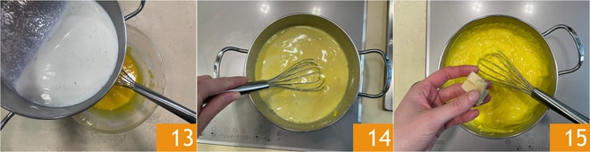 Vierta en la mezcla de yemas, azúcar y almidón la leche (después de retirar la vaina de vainilla) 13, mezcle y vuelva a poner al fuego 14, continuando a mezclar hasta que la crema comience a hervir, en este punto baje el fuego y añada el mazapán en cubos pequeños 15. Mezcle para que se disuelva. Vierta la crema en un recipiente bajo y ancho, cubra con film y coloque en el frigorífico hasta que se enfríe. Una vez lista, transfiera a una manga pastelera sin boquilla.