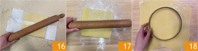 Retome el bloque de masa quebrada 16, extiéndalo a un espesor de 3-4 mm sobre una superficie ligeramente enharinada 17. Recorte la base con un aro de 22 cm 18.