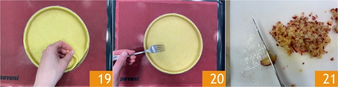 Colóquela en una bandeja para hornear, sobre papel de horno o una alfombrilla de silicona, y coloque encima el aro con la base de masa quebrada 19. Luego añada el borde de masa quebrada, obtenido de una tira de masa de 2 cm de grosor y 66 cm de longitud 20. Si no puede mover la tira fácilmente, puede hacer 2 de 33 cm (o incluso más cortas) y unirlas directamente en el molde. Perfore el fondo con un tenedor y luego deje enfriar en el frigorífico 30 minutos, para mantener mejor la forma durante la cocción. Hornee la base en horno estático precalentado a 175° durante unos 25-30 minutos. Mientras tanto, corte las ciruelas en gajos, reserve algunas rodajas para la decoración y el resto puede cortarlas en cubos pequeños 21.