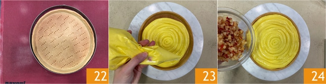 Una vez que la base esté lista y fría 21, puede rellenar con la crema pastelera, que también estará fría y colocada en la manga pastelera 23. Distribuya también las ciruelas en cubos 24.