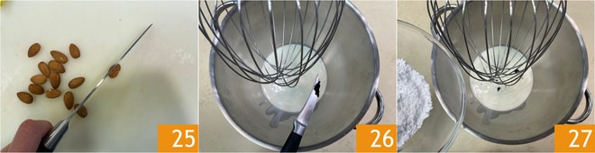 Corte las almendras en 4 partes a lo largo 25, luego prepare la chantilly montando la nata fresca líquida con las semillas de media vaina de vainilla 26 y el azúcar glas 27. Deberá resultar semi montada.