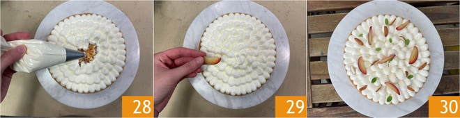 Vierta la nata en una manga pastelera con boquilla lisa de 10 mm y decore la tarta creando un motivo circular desde los bordes hacia el centro 28. Finalmente decore con las rodajas de ciruela 29, las almendras y algunas hojas de orégano fresco. ¡Su tarta de crema pastelera de almendras, chantilly y ciruelas está lista para servirse 30!