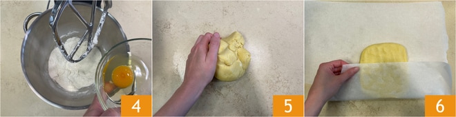 Mezcle con la pala hasta que la mezcla quede arenosa, en este punto agregue el huevo 4 y mezcle lentamente hasta que la mezcla esté suave y homogénea. Sáquela del robot y trabaje brevemente con las manos 5 para darle forma cuadrada, luego colóquela sobre papel de horno para envolverla 6.