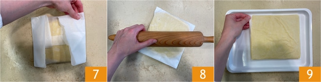 Ciérrela bien 7 y con el rodillo aplánela un poco más 8, luego colóquela en una bandeja 9 y déjela reposar en el frigorífico durante al menos 30 minutos o durante el tiempo de preparación de la crema pastelera.