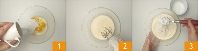 Para preparar la tarta con mermelada, vierte en un bol los huevos, la yema y el azúcar 1. Bate con las varillas eléctricas durante unos 5 minutos hasta obtener una mezcla esponjosa, clara y espumosa 2. Añade la harina 3.