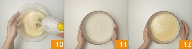 Trabaja bien con las varillas hasta obtener una mezcla homogénea y lisa 10. Toma un molde de 24 cm, úntalo con mantequilla y enharínalo 11, luego vierte la mezcla dentro 12. Llévalo al frigorífico durante 15 minutos.