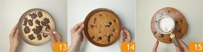 Saca el molde del frigorífico y añade la mermelada con una cuchara 13, luego hornea en el horno estático precalentado a 180° durante 35 minutos. Haz siempre la prueba del palillo para verificar la cocción interna. Una vez cocida, apaga el horno y deja la tarta en el horno con la puerta abierta durante 5 minutos. Luego, saca del horno, deja enfriar y espolvorea la tarta con mermelada de azúcar glas antes de servirla 15.