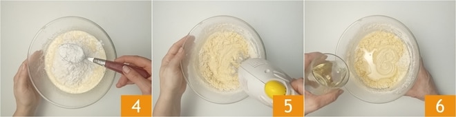 Añade también la fécula 4 e incorpórala con las varillas 5, luego vierte el aceite de semillas 6.