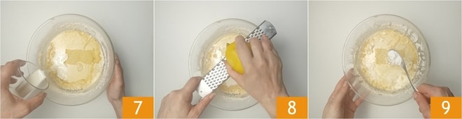 Añade también la leche fría 7, la ralladura de limón 8 y la levadura en polvo para postres 9.