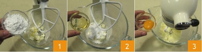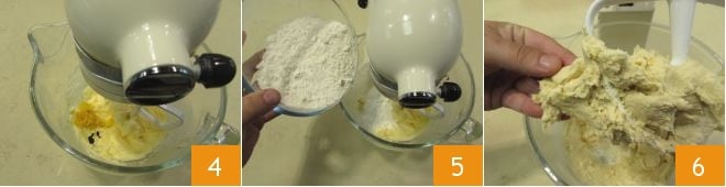 Abre la vaina de vainilla a lo largo y saca las semillas, viértelas en la batidora junto con la ralladura de limón 4. Tamiza la harina y viértela toda de una vez en la batidora 5 continúa mezclando hasta que la mantequilla haya incorporado toda la harina y la masa sea homogénea 6.