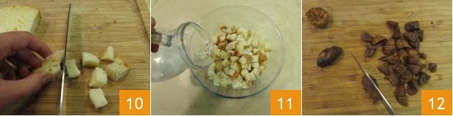Corta el pan en cubos 10, colócalo en un bol y empápalo con la leche entera y la de almendras 11 y deja que absorba. Corta los higos secos en trozos pequeños 12.