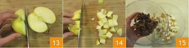 Lava las manzanas y córtalas en cubos sin pelarlas (13-14). Incorpora al pan también los higos secos 15,