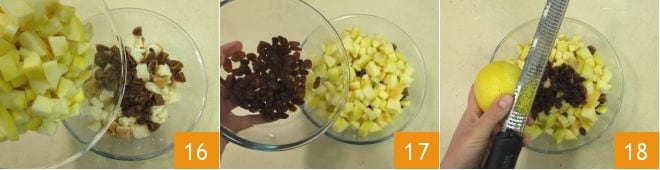 las manzanas 16 y las pasas remojadas en ron y escurridas 17. Aromatiza con la ralladura de limón 18
