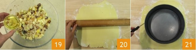 y sazona con la miel de acacia 19. Deja a un lado el relleno y retoma la masa: extiéndela sobre una superficie ligeramente enharinada a un grosor de aproximadamente medio centímetro 20. Coloca encima un molde desmontable de 22 cm y recorta la masa siguiendo la forma del fondo 21.