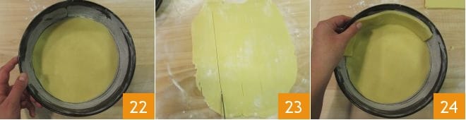 Coloca el disco obtenido dentro del molde ya enmantecado y enharinado 22. Extiende otro trozo de masa para sacar tiras rectangulares 23 para aplicar en el borde 24.