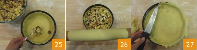 En este punto, vierte el relleno dentro del molde 25. Extiende la masa restante, siempre a medio centímetro de grosor, enróllala sobre el rodillo y extiéndela sobre el molde 26, así cerrarás la tarta. Corta el exceso de masa con un cuchillo 27.
