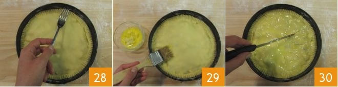 Crea un motivo decorativo en el borde presionando ligeramente con los dientes del tenedor 28. Pinta la superficie con huevo batido 29 y haz cortes en la masa creando rayos 30, permitirán la salida de vapor durante la cocción.