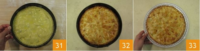 El dulce está listo para la cocción 31, hornéalo en horno estático precalentado a 170° durante 45 minutos, en la bandeja del medio. Una vez cocido, saca la tarta cubierta con manzana, frutos secos y pan 32, déjala enfriar y luego desmóldala 33.