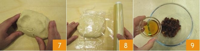 Luego vuelca la masa sobre una superficie de trabajo, moldéala para darle una forma cilíndrica 7, aplánala y envuélvela en film transparente 8. Guárdala en el frigorífico por un par de horas. Mientras tanto, prepárate para el relleno: lava y luego pon a remojar las pasas en el ron 9.