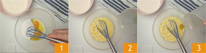 Para preparar la tarta de agua al cacao, en primer lugar, en un bol, trabaja con un batidor de mano o batidoras eléctricas los huevos con el azúcar 1. Una vez obtenido un compuesto homogéneo y cremoso, añade el agua 2, el aceite de girasol 3 y la sal.