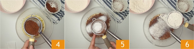 Mezcla y añade el cacao amargo tamizándolo 4. Incorpora luego la levadura también tamizándola 5. Finalmente, vierte la harina poco a poco 6.