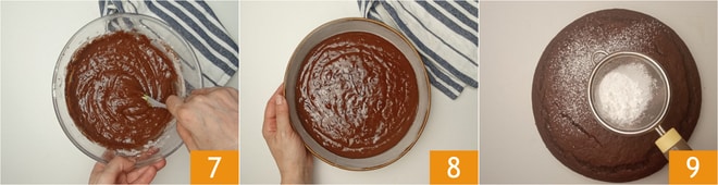 Mezcla bien hasta obtener una mezcla lisa y homogénea 7. Vierte en un molde ligeramente engrasado y enharinado de 24 cm de diámetro y nivela bien, sacudiendo el molde suavemente 8. Hornea en horno estático a 180° durante 40 minutos en la parte media del horno. Haz la prueba del palillo para verificar la cocción. Si sale seco, la tarta está lista y podrás sacarla del horno. Déjala enfriar bien antes de desmoldarla y adorna con azúcar glas al gusto 9.