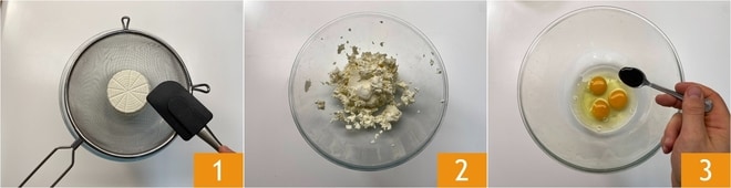 Para preparar la tarta de albaricoques y ricotta, tamiza la ricotta a través de un colador 1 para obtener una crema sin grumos 2. En un bol, rompe los huevos y añade el extracto de vainilla 3.
