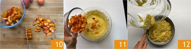 Corta en cubos los albaricoques restantes 10 y sumérgelos en la mezcla 11. Transfiere la mezcla a un molde de 20 cm engrasado y enharinado 12.