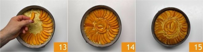 Distribuye en la superficie las rodajas de albaricoque 13 para crear un motivo en forma de rayo 14 y hornea en horno estático precalentado a 170° durante unos 70 minutos. La tarta de albaricoques y ricotta está lista 15, déjala enfriar un poco, luego desmóldala y sírvela espolvoreándola con azúcar glas.