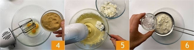 Bate los huevos con una batidora eléctrica a velocidad media alta, vertiendo poco a poco el azúcar 4, esto tomará unos 10 minutos. Una vez que obtengas una mezcla clara y espumosa, incorpora la ricotta, una cucharada a la vez 5. Tamiza aparte la harina y la levadura 6,