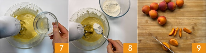 Incorpora el aceite en hilo 7, luego añade las harinas poco a poco a la mezcla, manteniendo la batidora a baja velocidad 8. Lava y seca los albaricoques: 4 te servirán para la decoración, de estos obtén 12 gajos en total 9.